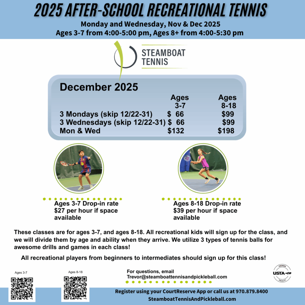 Sign up for the whole session to receive a slightly discounted rate, or, enjoy maximum flexibility with our standard-priced drop-in rate. Discounted session prices will not be pro-rated for any reason, including unplanned absences or signing mid session. For questions about our junior program, please contact Jason Scicchitano, Director of Tennis, directly at, Jason@steamboattennisandpickleball.com or by phone at, 703-338-4013.